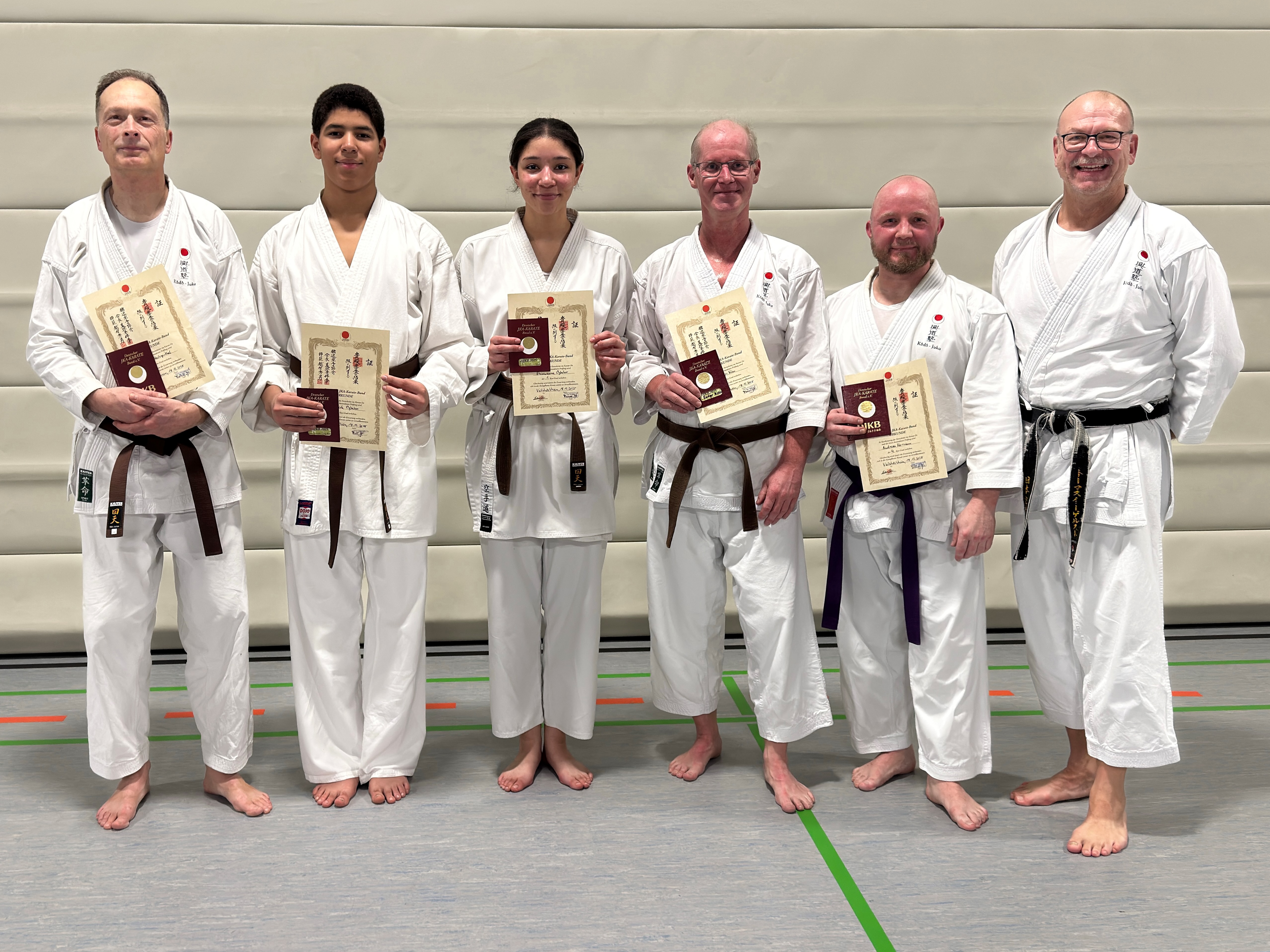 Andreas Herrmann zum 4. Kyu (2. Blaugurt), Robert Heiligenthal und Omorede Ogbebor zum 3. Kyu (1. Braungurt) sowie Dr. Rüdiger Klein und Ehinwenma Ogbebor zum 1. Kyu (3. Braungurt).